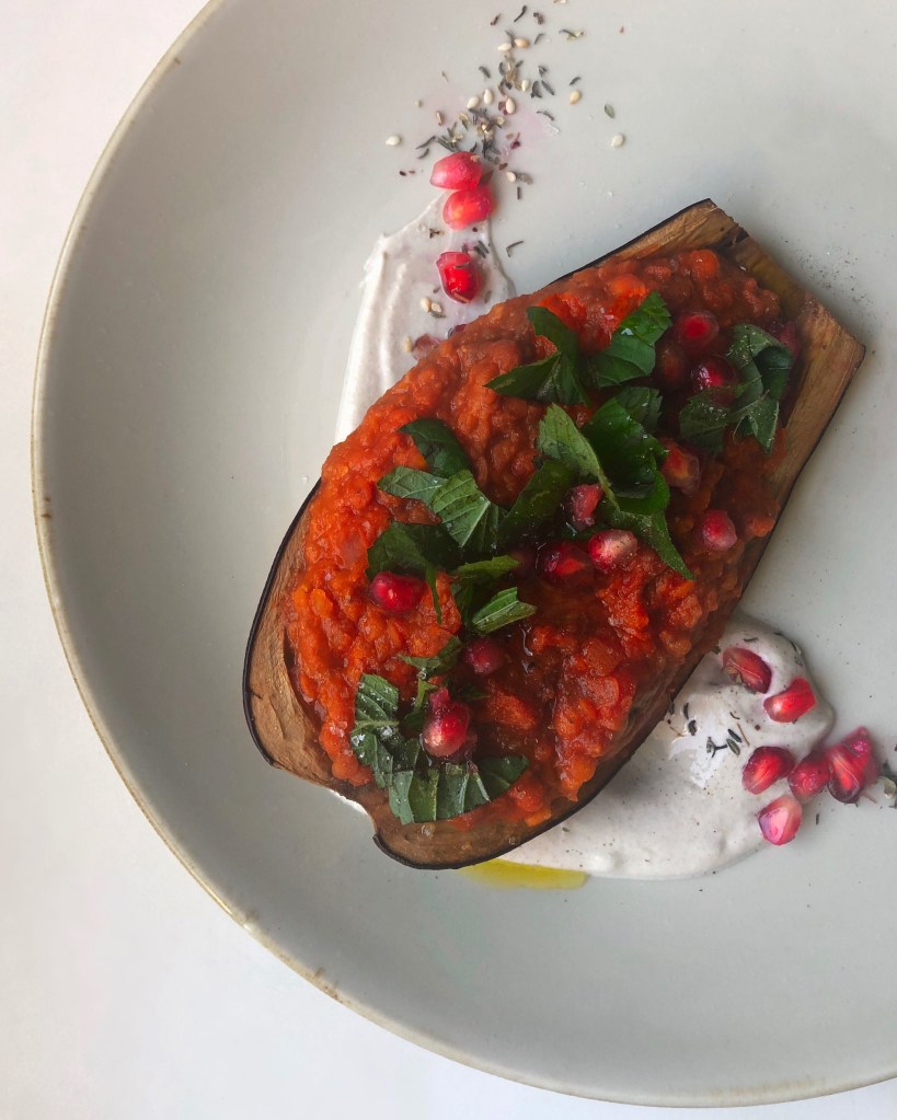 Orientalische Küche: eine Vielfalt an Aromen, bunt und immer wieder aufregend für die Geschmacksnerven. Dieses Gericht überzeugt mit einer Frische durch Limette, Granatapfel, Tomate, Minze & Zaatar. Das Fleisch der Auberginen wird mit roten Linsen, Passata und Knoblauch geköchelt, und in die gebackenen Auberginen gefüllt. Der Tahini-Dip mit Limette ergänzt den würzigen Geschmack des Ofengerichts perfekt & schmeckt herrlich sommerlich. Ein wunderbares Wohlfühlgericht für warme Sommertage.