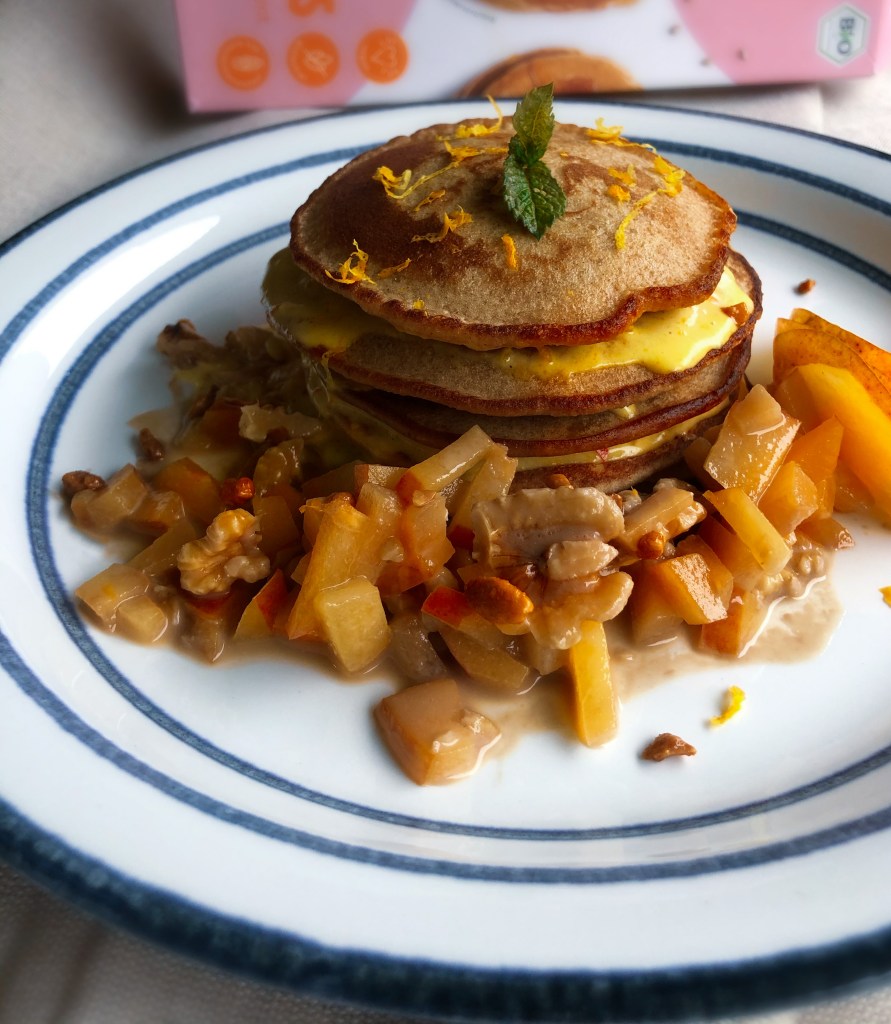 Jetzt die Pancakes nach Packungsanleitung zubereiten und noch warm, mit jeweils einer Schicht Mascarpone-Creme dazwischen, anrichten. Den Pflaumen-Nuss-Salat um die Pancakes herum verteilen und mit einem Hauch Zitronensaft beträufeln. Zum Schluss die Pancakes mit extra Orangenschale garnieren und mit dem fein salzigen Erdnusskrokant dekorieren (Ein tolles Geschmacksspiel zwischen süß und salzig.).